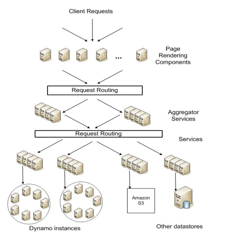 图 1 是一张简化之后的 Amazon 平台架构图。可以看到,动态 web 内容由页面渲染组件 提供,而它是通过调用其他的一些服务来完成这项工作的。