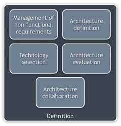 架构师身上有许多不同的品质,而他们过去的经验通常是承担这个角色所需能力的一种 很好度量(gauge)。架构师的角色包括很多方面,因此你需要更深层次地去观察和理解他们 在不同方面展现出来的参与度、影响力、领导力和责任担当。 宽泛地说,大部分项目的软件架构过程可以分成两个阶段:定义阶段和 交付阶段(the architecture is defined and then it’s delivered)。