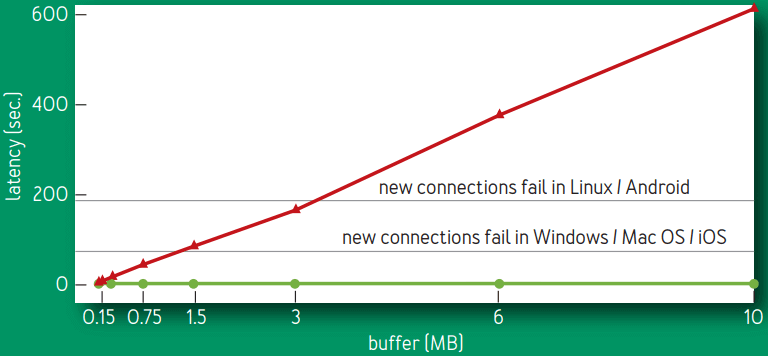 - 当移动设备通过一个大缓冲区的 SGSN 接收大块数据时(例如,手机软件自动更新), 那这个设备就无法连接到互联网上的任何东西,直到队列被清空(SYN-ACK accept packet 被延迟的时间大于固定 SYN timeout)。