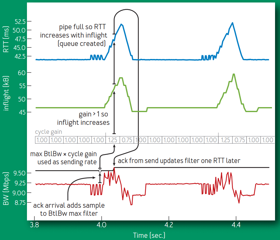 If the bottleneck bandwidth increases, BBR must send faster to discover this. Likewise, if the actual round-trip propagation delay changes, this changes the BDP, and thus BBR must send slower to get inflight below BDP in order to measure the new RTprop. Thus, the only way to discover these changes is to run experiments, sending faster to check for BtlBw increases or sending slower to check for RTprop decreases. The frequency, magnitude, duration, and structure of these experiments differ depending on what’s already known (startup or steady-state) and sending app behavior (intermittent or continuous).