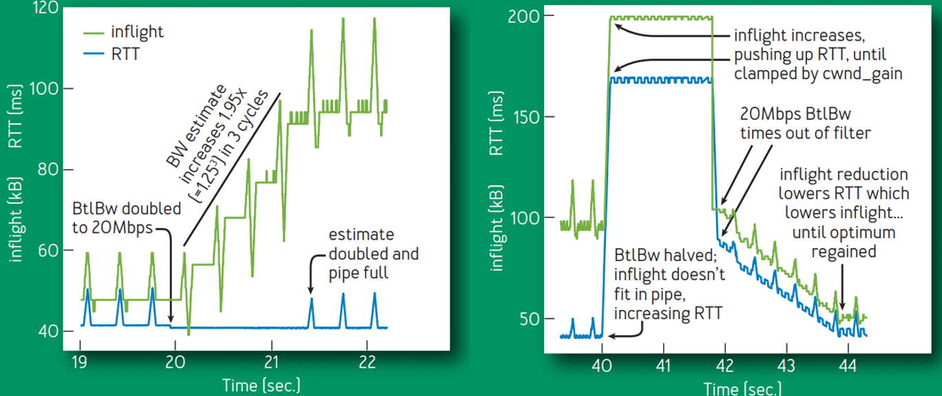 Note that BBR’s Startup and CUBIC’s slow start both explore the bottleneck capacity exponentially, doubling their sending rate each round; they differ in major ways, however. First, BBR is more robust in discovering available bandwidth, since it does not exit the search upon packet loss or (as in CUBIC’s Hystart10) delay increases. Second, BBR smoothly accelerates its sending rate, while within every round CUBIC (even with pacing) sends a burst of packets and then imposes a gap of silence. Figure 4 demonstrates the number of packets in flight and the RTT observed on each acknowledgment for BBR and CUBIC.