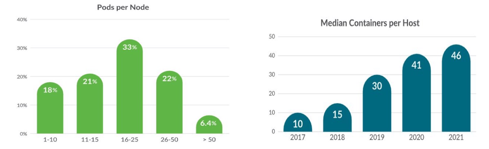- 左图是容器的部署密度分布,比如 33% 的 k8s 用户中,每个 node 上平均会部署 16~25 个 Pod;