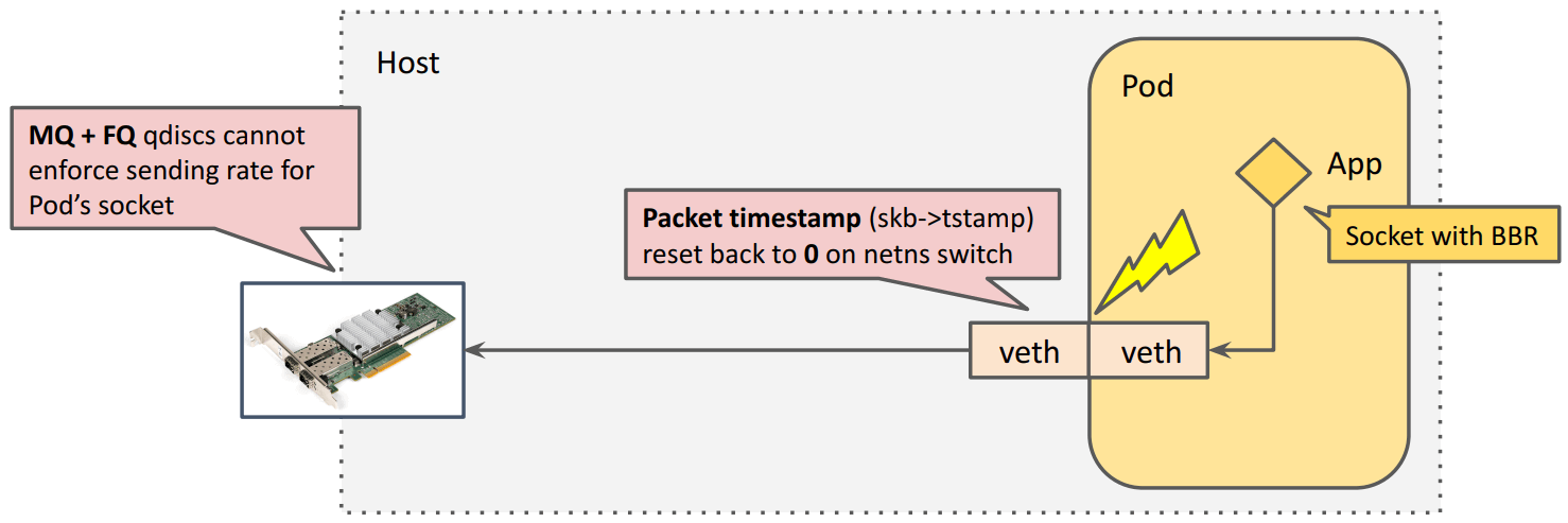 - 内核在 skb 离开 pod netns 时,将 skb 的时间戳清掉了,导致包进入 host netns 之后没有时间戳,FQ 无法工作