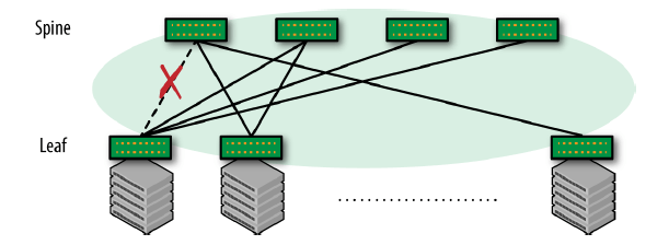 - 全连接(full-mesh):故障时影响面小;总带宽高,而且方便扩展,总带宽只受限于 Spine 的接口数量