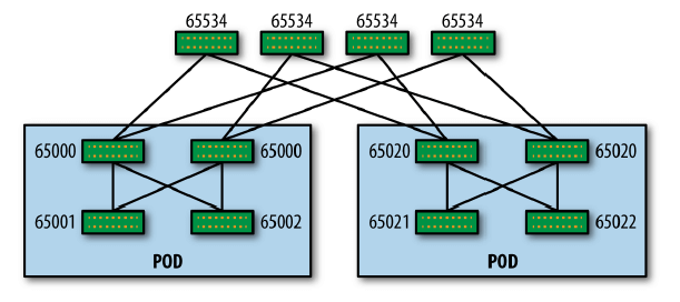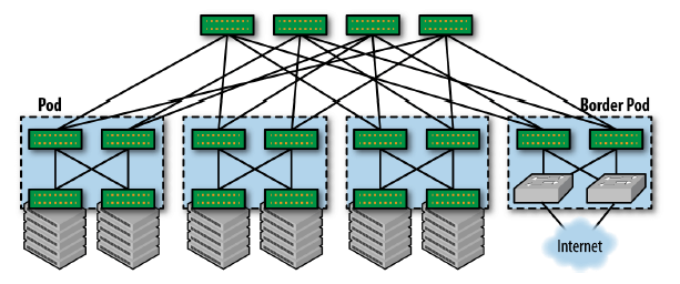 一组 ToR 和 Leaf 组成一个二级 Clos,称为一个 pod 或 cluster; pod/cluster 作为一个独立单元再和 Spine 组成一个二级 Clos。