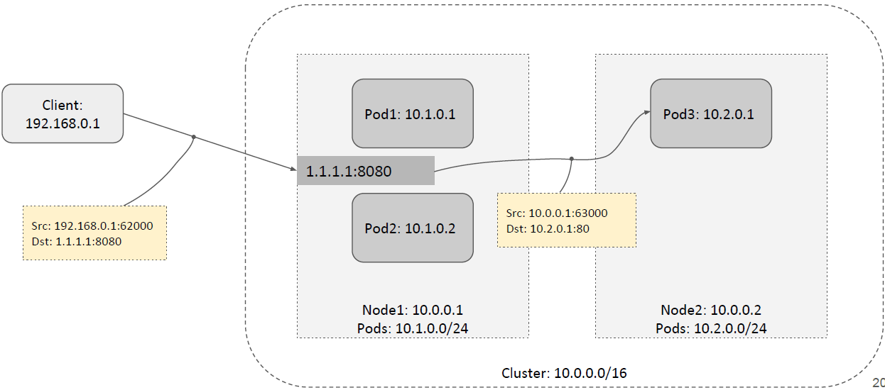 同样,这里的后端 Pod 也可以在其他 node 上,这时除了做 DNAT 还需要做一次 SNAT, 如下图所示: