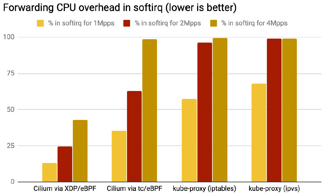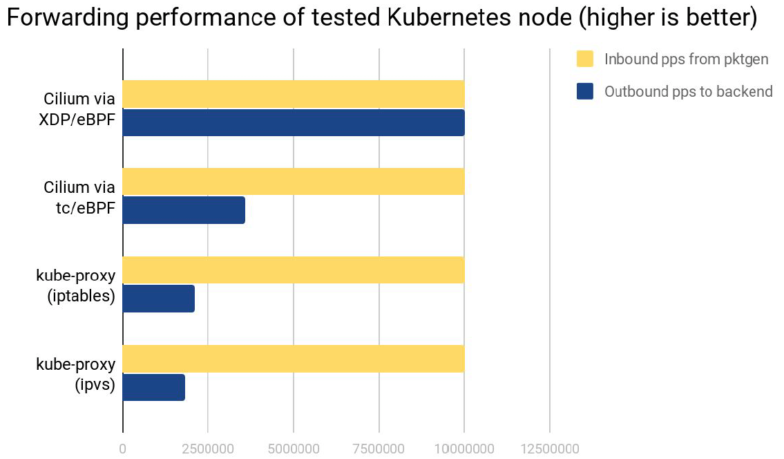 - Cilium XDP 模式:能够处理全部的 10Mpps 入向流量,将它们转发到其他节点上的 backend pods。
