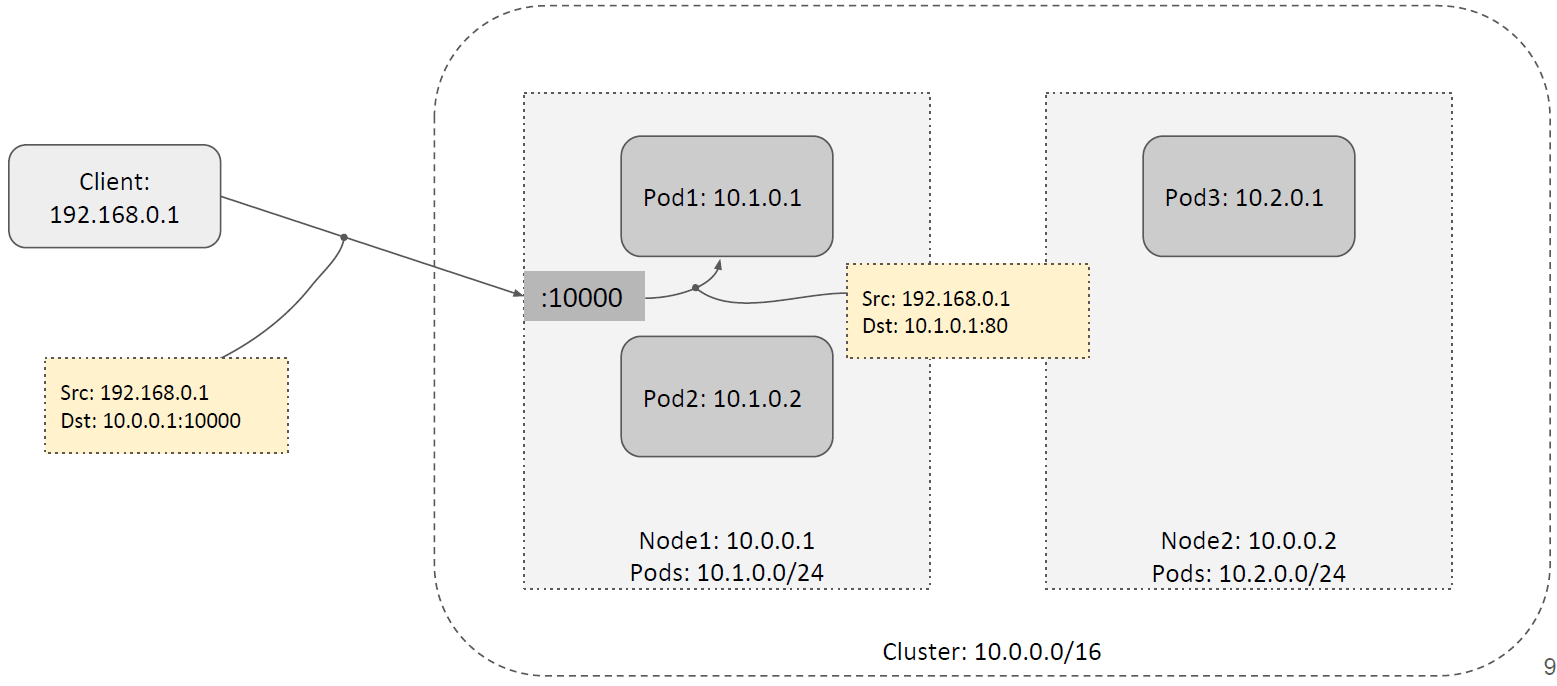 HostIP:HostPort访问服务,例如上图中访问10.0.0.1:10000; - 宿主机先对流量进行 DNAT,然后转发给 Pod。