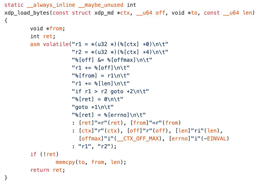 下面是一个具体例子:xdp_load_bytes(),使用下面这段等价的汇编代码,才能
