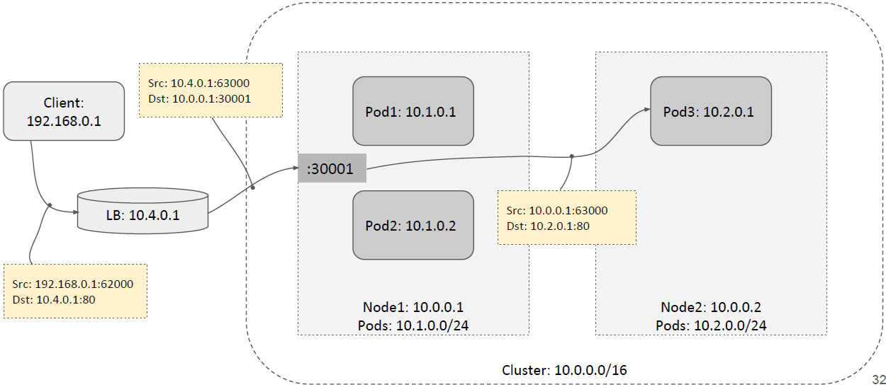 30001 端口时,它可以对请求做 DNAT 然后转发给本节点内的 Pod,如下图所示,