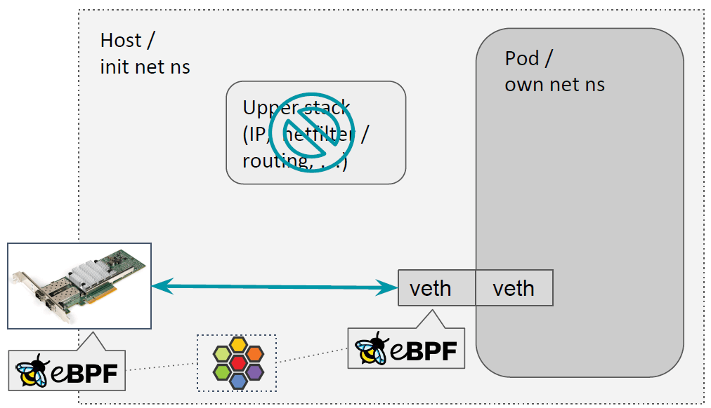 - K8s 默认安装了一些 iptables rule,用来检测从连接跟踪的角度看是非法的连接 (‘invalid’ connections on asymmetric paths),然后 netfilter 会 drop 这些连接 的包。我们最开始时曾尝试将包从宿主机 tc 层直接 redirect 到 veth,但应答包却要 经过协议栈,因此形成了非对称路径,流量被 drop。因此目前进和出都都要经过协议栈。