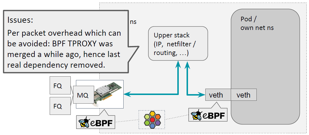 不久之前,BPF TPROXY 已经合并到内核,因此最后一个真正依赖 Netfilter 的东西已经 解决了。因此我们现在可以在 TC 层做全部逻辑处理了,无需进入内核协议栈,如下图所示: