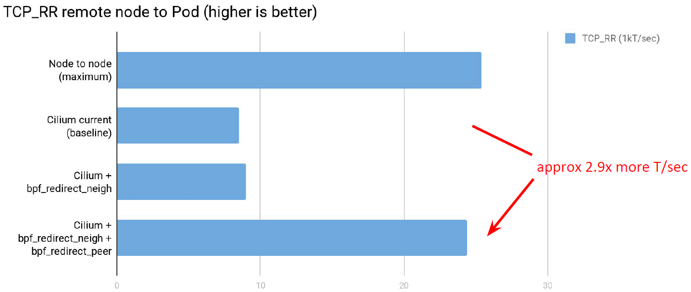 更有趣的是 TCP_RR 的场景,以 transactions/second 衡量,提升了 2.9 倍,接近最