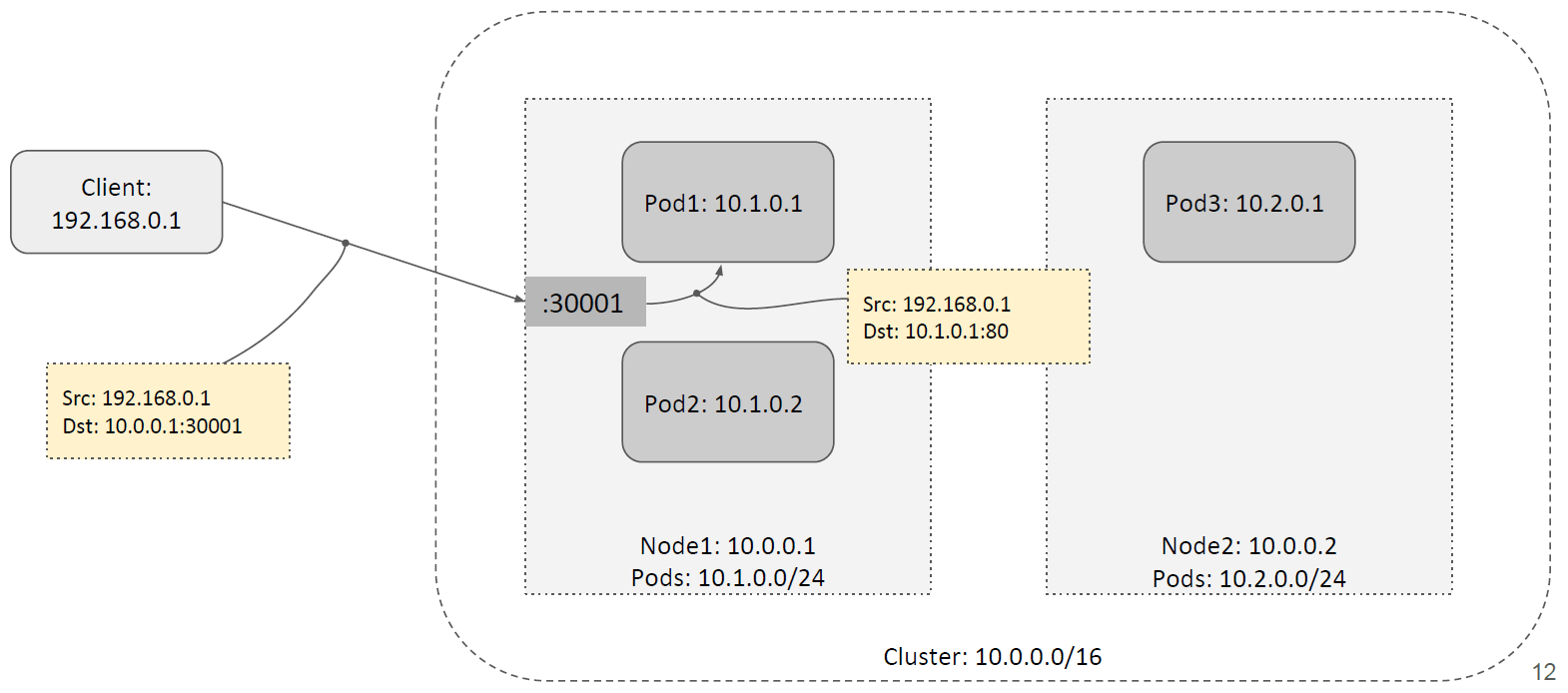 如下图所示,假设这里的 NodePort 是 30001。当客户端请求到达任意一台 node 的
