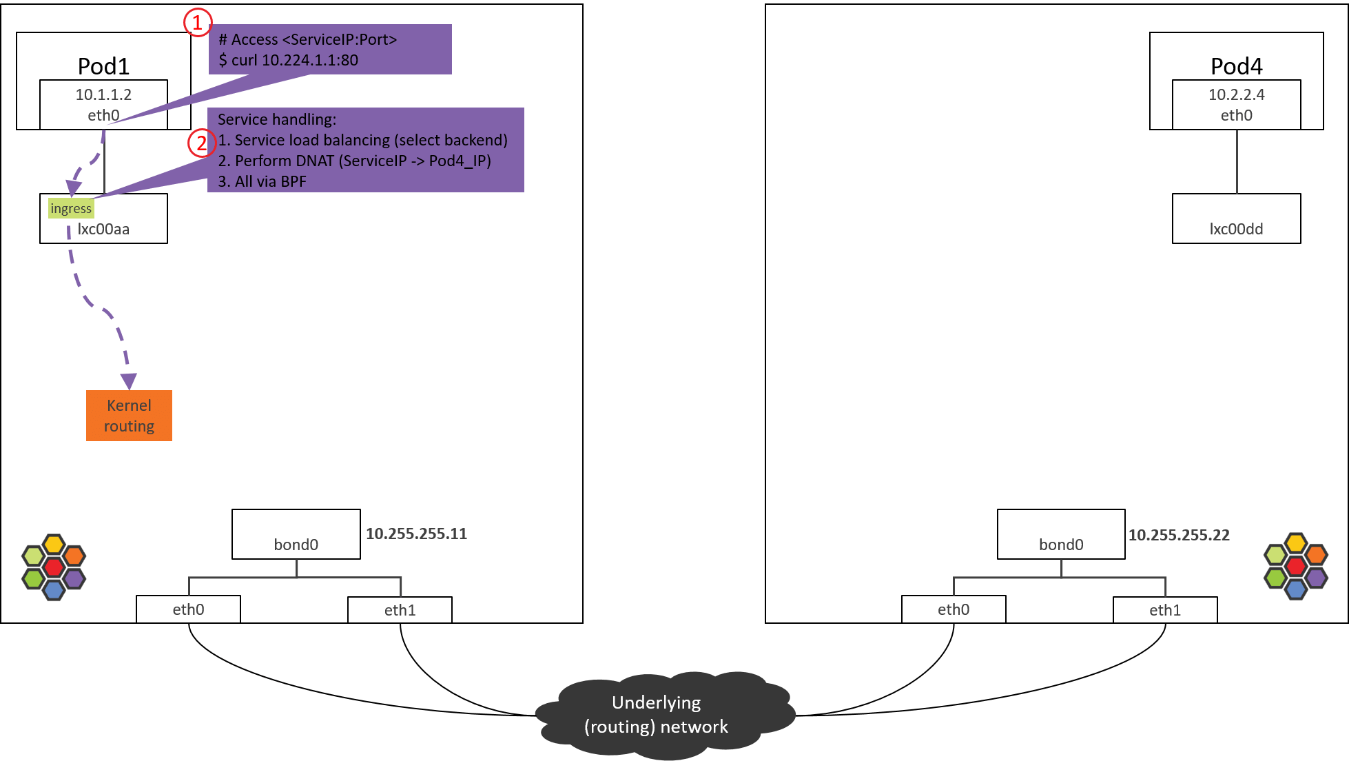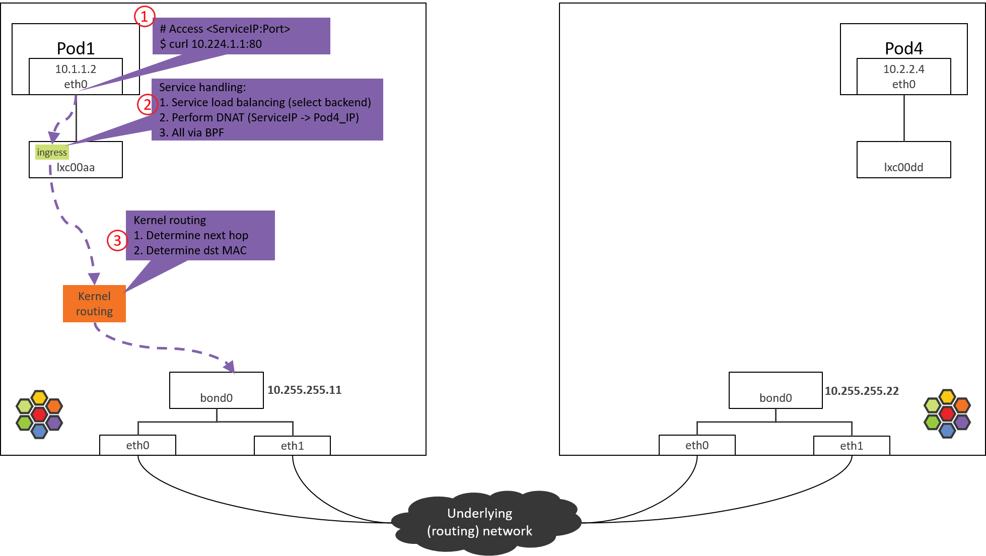 With 2 & 3, all the hooking and modification jobs on the traffic will be fulfilled by BPF code, thus completely removes Netfilter/iptables dependency, this is the so-called kube-proxy free mode.