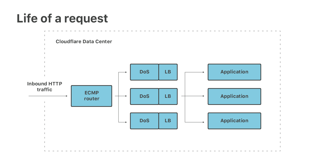- 包到达路由器,路由器通过 ECMP 将包转发给下一级服务器。我们用 ECMP 在后端 机器(至少 16 个)之间分发数据包,这是最底层的(rudimentary)的负载均衡技术