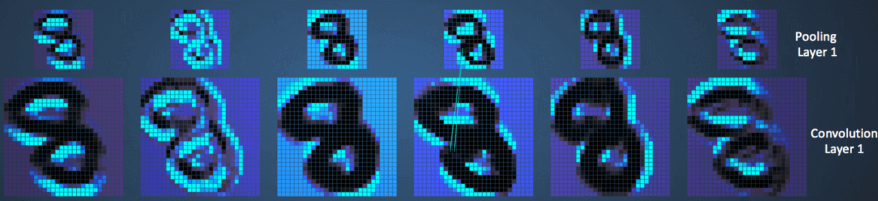 图 18: Visualizing a CNN trained on handwritten digits. 注意 ReLU 没画出来。 Source [13]