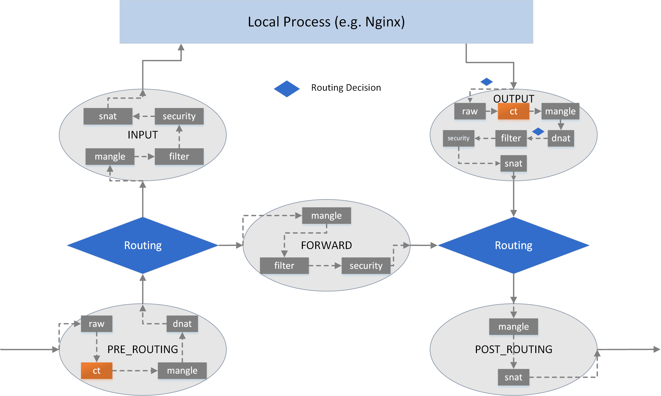 filter: common filtering, e.g. accept, reject/drop, jump.nat: network address translation, including SNAT (source NAT) and DNAT (destination NAT).mangle: modify packet attributes, e.g. TTL.raw: earliest processing point, special processing before kernel connection tracking (conntrackorCT, also included in the below figure, but this is NOT a chain).security: not covered in this post.