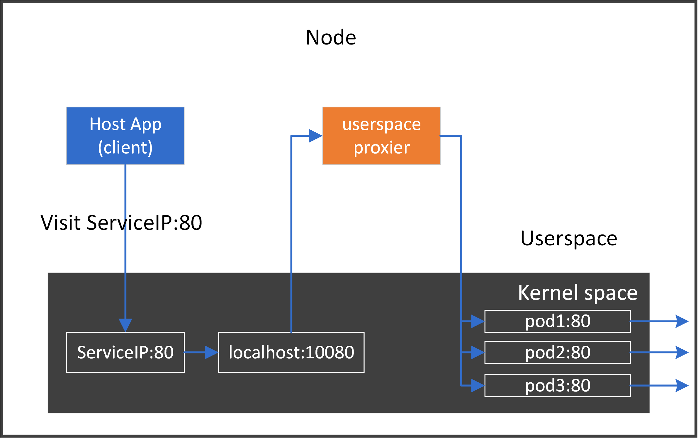 With our toy proxiers, applications (whether it’s a host app, or an app running inside a VM/container) on a non-k8s-node (thus not in K8S cluster) can also access K8S services with ClusterIP - note that in Kubernetes’s design, ClusterIP is only accessible within K8S cluster nodes. (In some sense, our toy proxier turns non-k8s-nodes into K8S nodes.)