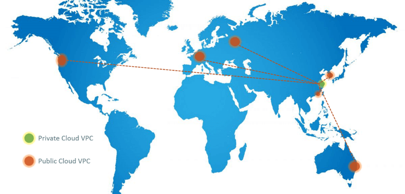 Network segments of VPCs on both prviate and public cloud are arranged to be non-overlapped, so we connect them with direct connect techniques, and the IP is routable (if needed).