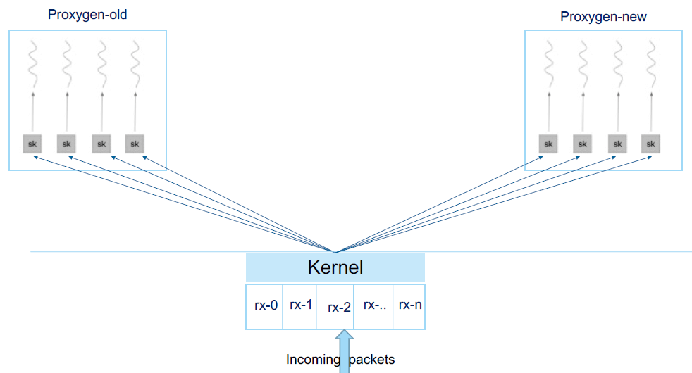 这也解决了扩展性问题,现在可以并发接收包(one-thread-per-socket),不用担心新进程启动时的 disruptions 或 misrouting 了: