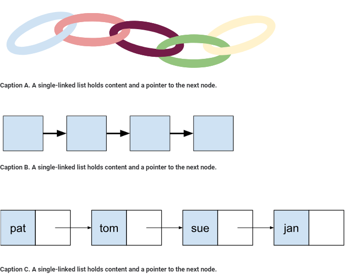 A single-linked list holds content and a pointer to the next node.