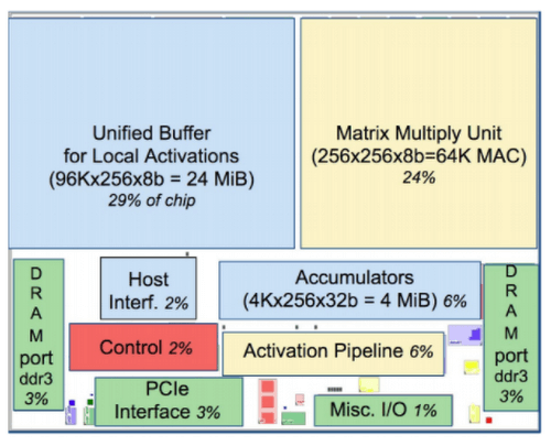 Floor Plan of Google TPU die(yellow = compute, blue = data, green = I/O, red = control) [11]