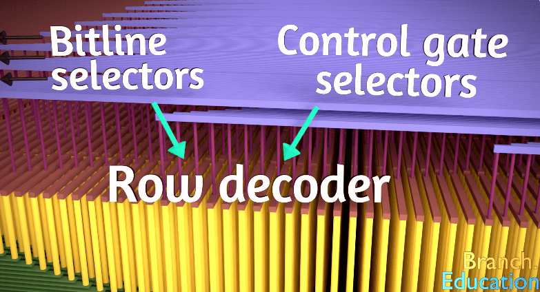 - 两侧的 control gate & bit line selector 组成了所谓的行解码器,通过这两组选择器就可以访问任意 Page;