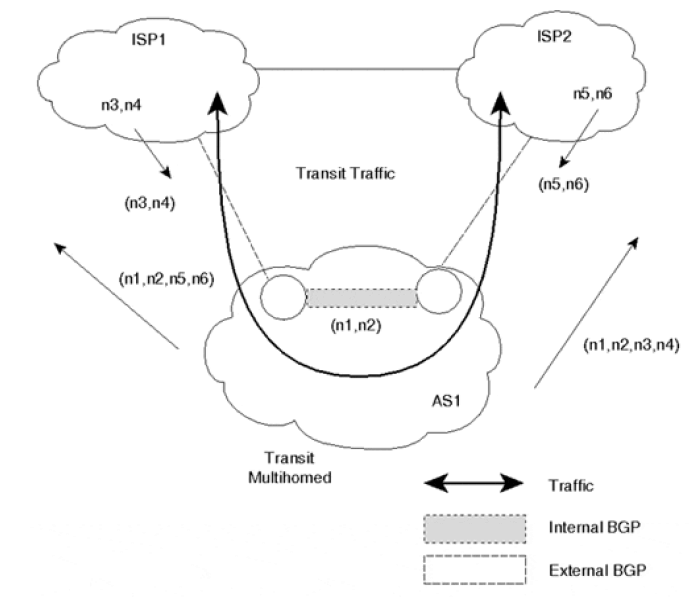 则,当 ISP1 和 Foonet 的网络发生故障之后,目的是 198.32.1.1 的流量从 ISP2 到达 ISP1 时,会匹配到默认路由,流量会绕回 ISP2,形成环路。