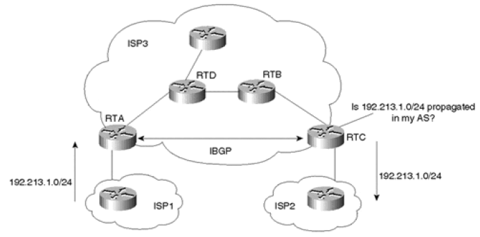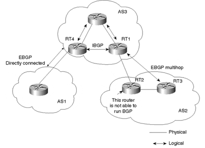 考虑图 8-2。RTC 和 RTD 和外面的 AS 运行 eBGP;在 AS 内部,它们两个之间运行 iBGP 。但是,他们不是直连的,要经过 RTA 和 RTB 两个非 BGP 路由器。RTA 和 RTB 会和 AS 内的所有路由器运行 IGP 协议,因此它们看不到所有的外部路由(BGP 路由)。
