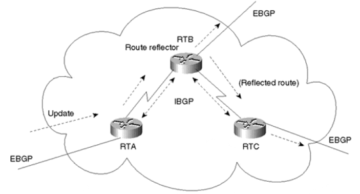 因此,如果 RTA-RTC 之间没有做 peer,RTC 就收不到 RTA 的消息;所以没有 RR 的情况 下必须得用 full-mesh。