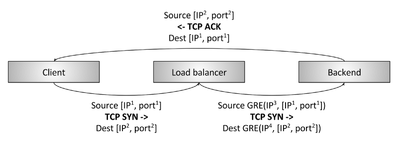 - 与 NAT 不同,负载均衡器通常使用 GRE(Generic Routing Encapsulation)将 IP 包封 装发送到后端。后端收到后进行解封装,就可以拿到原始的 IP 包,里面有客户端的 IP 和 port 信息。因此后端可以直接将应答包发给客户端,而不需要经过 LB;