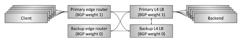 - 两个边缘路由器和两个负载均衡器都是交叉连接的。这意味着,如果一个边缘路由器或一 个负载均衡器挂了,或者由于某种原因之前声明的 BGP 权重收回了(withdraw), backup 马上可以接受所有流量