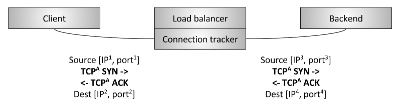 第二种 L4 负载均衡是 passthrough,如图 9 所示。在这种类型中,TCP 连接不会被负载 均衡器 terminate,而是在建立连接跟踪和网络地址转换(NAT)之后直接转发给选中的后 端。我们首先来定义连接跟踪和 NAT:
