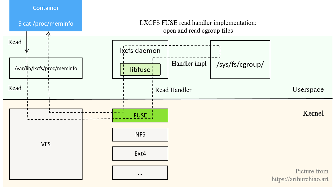 忘了 FUSE 基本工作原理的,再来借 lxcfs 快速回忆一下: