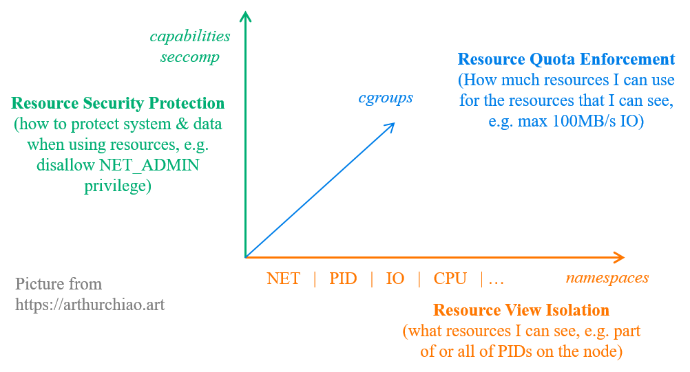 namespace:一种资源视图隔离机制, 决定了进程可以看到什么,不能看到什么;例如,pid namespace 限制了进程能看到哪些其他的进程;network namespace 限制了进程能看到哪些网络设备等等。cgroup:一种限制资源使用量的机制,例如一个进程最多能使用多少内存、磁盘 I/O、CPU 等等。- (译) Control Group v2 (cgroupv2)(KernelDoc, 2021)