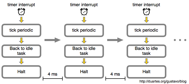 基本原理:CPU 空闲时, 如果内核知道下一个任务何时到来(例如,一个进程设置了 5s 的定时器), 就 关闭或延迟 timer interrupt。