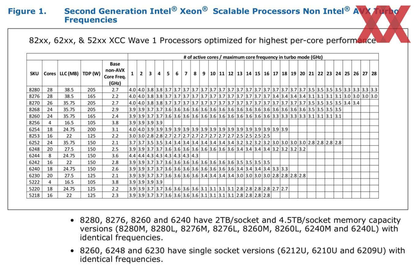 不同厂商设置的 max freq 可能不一样,比如 DELL 设置到了 3.9G(max turbo), 其他两家设置到了 2.8G(all-core turbo),上面监控可以看出来;下面这个图是最大频率和能运行在这个频率的 CORE 数量的对应关系:
