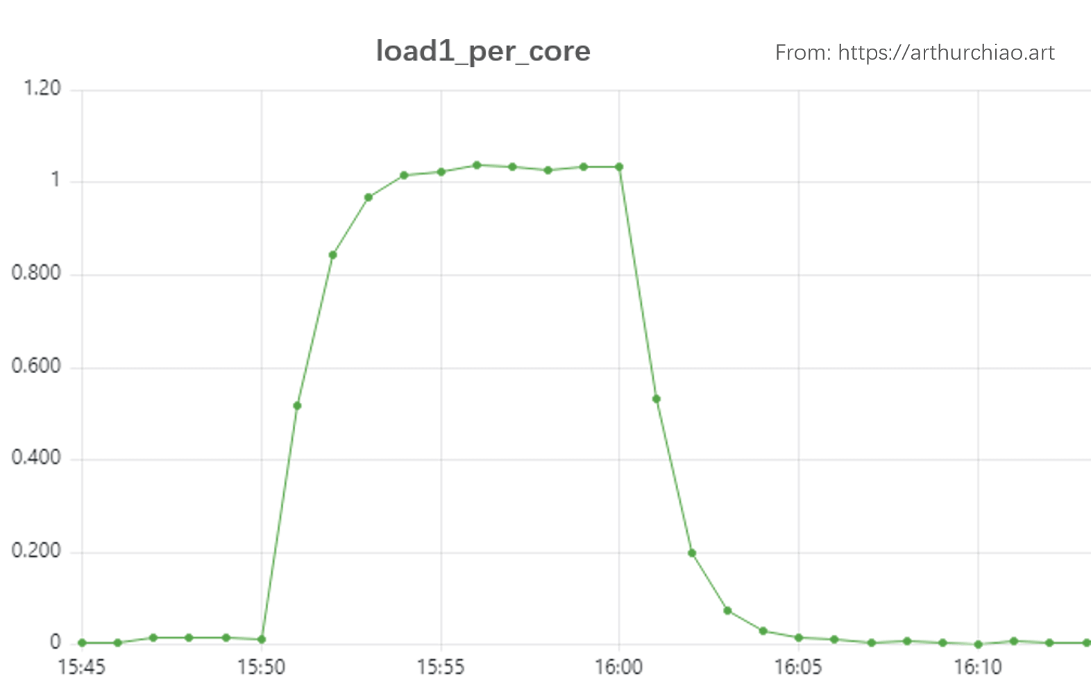 就告警出来。加上后前几天平安无事,但某天突然收到了一台机器的告警,它的 load1_per_core 曲线如下: