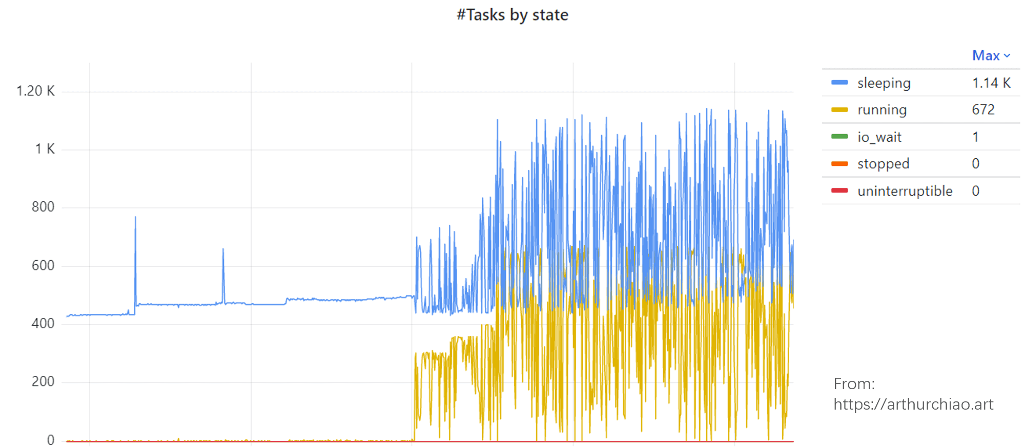 running 线程增多时 sleeping 减少,running 减少时 sleeping 增多,数量对得上。 所以像是 600 来个线程不断在 sleeping/running 状态切换。