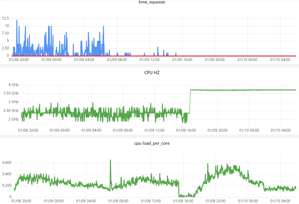lscpu输出收集的, 表示的应该是所有 CPU 中运行频率最高的那个;实际上 per-CPU 展示更合理,详见 本站后面的 Linux 服务器系列文章 [4]);而且即使负载比原来更高,也不会有 time_squeeze 了,