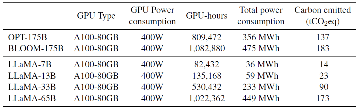 - 我们在 2048 个 A100 80GB 上,用了约 5 个月时间来开发 LLaMA。 根据前面的公式,计算得到 LLaMA 的训练成本约为 2638 MWh,总排放量为 1015 tCO2eq。