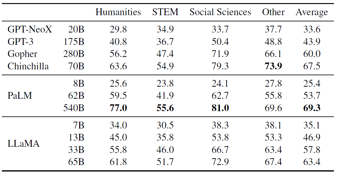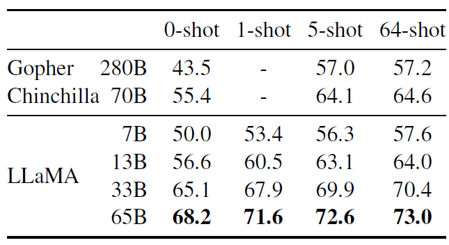 ,而 LLaMA-65B 则与最佳模型 Chinchilla-70B 和 PaLM-540B 相当。