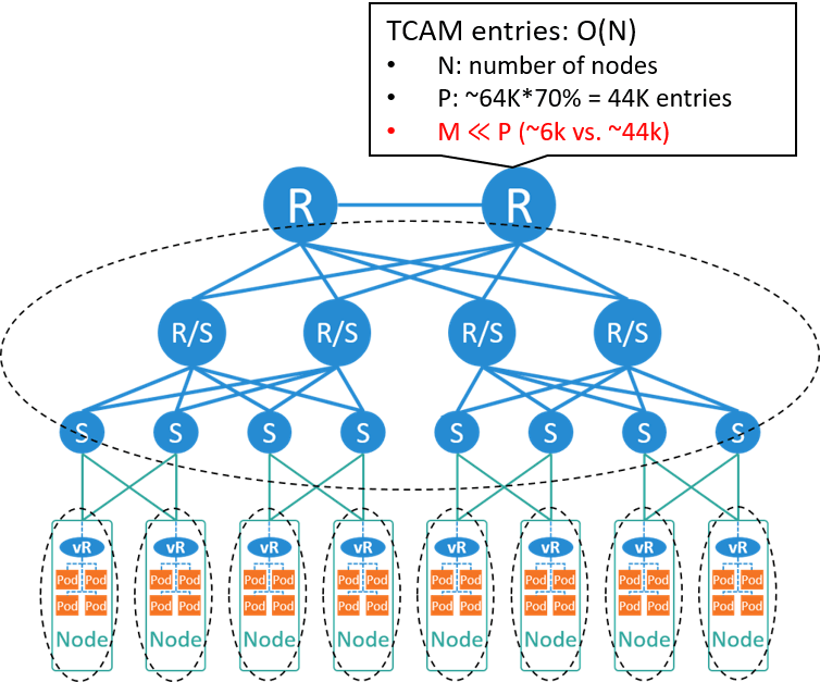 在这种网络方案中,与计算节点规模相关的瓶颈最可能出现在核心交换机,因为要实现 任何两台之间节点之间可达,核心交换机需要占用硬件表项(FIB TCAM)来记录集群内所有 主机的 IP/MAC 信息。