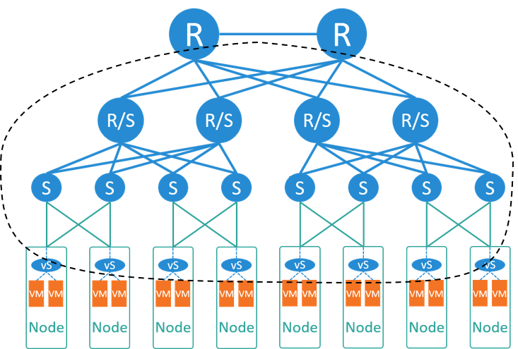 - 在每个 node 内用虚拟路由器(vrouter)替换虚拟交换机(vswitch),将整 张大二层网络拆分成众多的小二层网络。