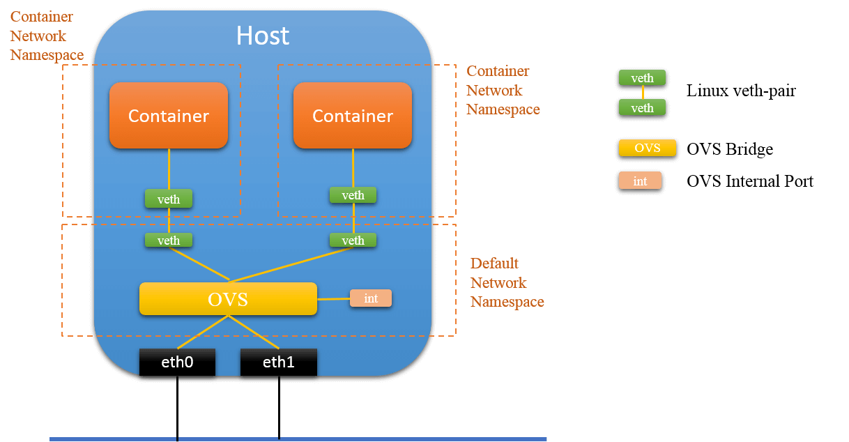As containers have their own network namespaces, we could not connect container to OVS directly, the latter works in the default namespace. The typical way to solve this is to create a veth pair: move one end to container, and the other end attached to OVS.