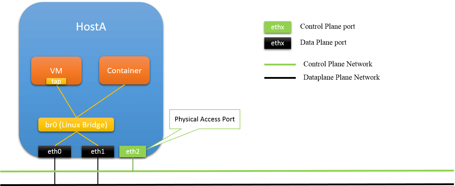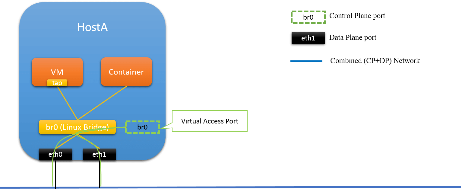In this solution, a physical port is reserved for host accessing, and not connected to Linux bridge. It will be configured with an IP (thus L3 port), and all CP traffic will be transmited through it. Other ports are connected to Linux bridge (L2 ports), for DP forwarding.