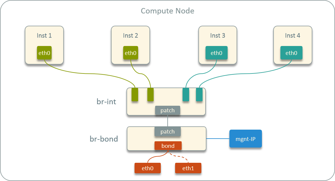 While inside each compute host, all instances connected to a OVS bridge, and the default route inside container points to its own (distributed) gateway.
