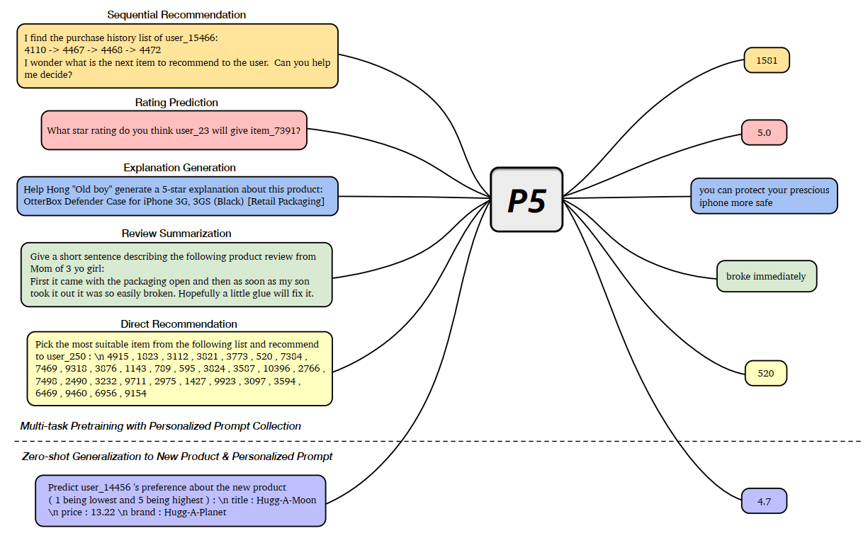 Figure 1: P5 pretrains on an encoder–decoder Transformer model that takes in textual inputs and produces target responses. We trained P5 on a multitask collection of personalized prompts. After multitask prompt-based pretraining on recommendation datasets, P5 achieves the capability of zero-shot generalization to unseen personalized prompts and new items.