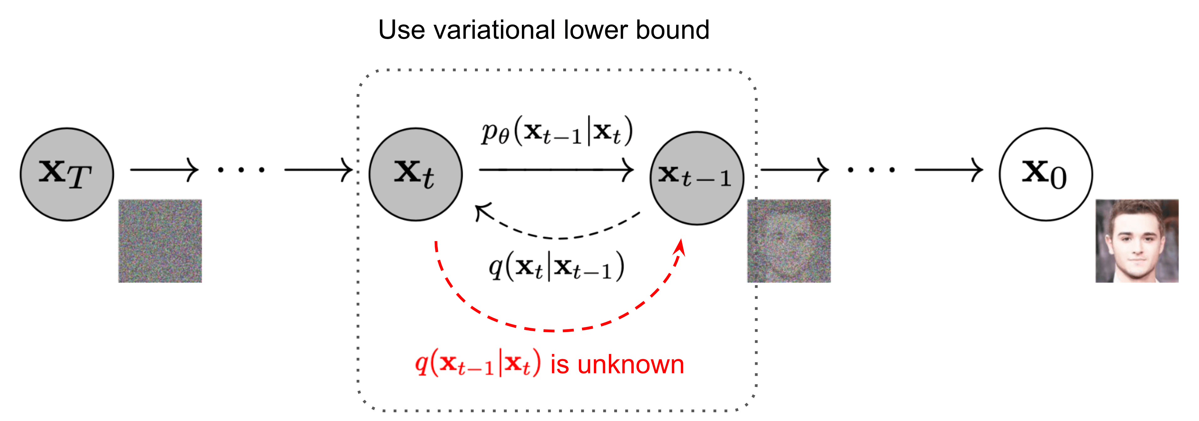 正向过程定义好了,是否能定义一个反向过程 \(q\left(\mathbf{x}_{t-1} \mid \mathbf{x}_{t}\right)\), 从噪声回溯到图像呢?